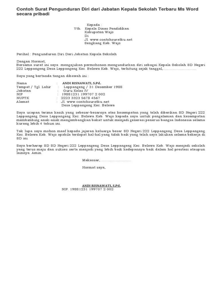 3 contoh surat pengunduran diri kerja, perusahaan, sekolah dll. Bersama surat ini saya mengajukan permohonan mengundurkan diri sebagai kepala sekolah sd . Mengundurkan diri dari jabatan atau lingkungan yang sedang dinaunginya. Ibu kepala sekolah (nama sekolah) dan kepada jajaran komite, guru, . Bunga rampai 09 01 no.